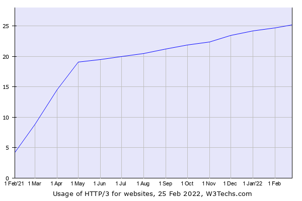 http/3.0은 블로그 글을 쓰고 있는 2022년 2월 25일 기준 w3techs에 따르면 http/2.0의 사용이 50%에 조금 못미치는 수준임에도 불구하고 벌써 http/3.0을 지원하는 웹사이트가 25%씩이나 된다.